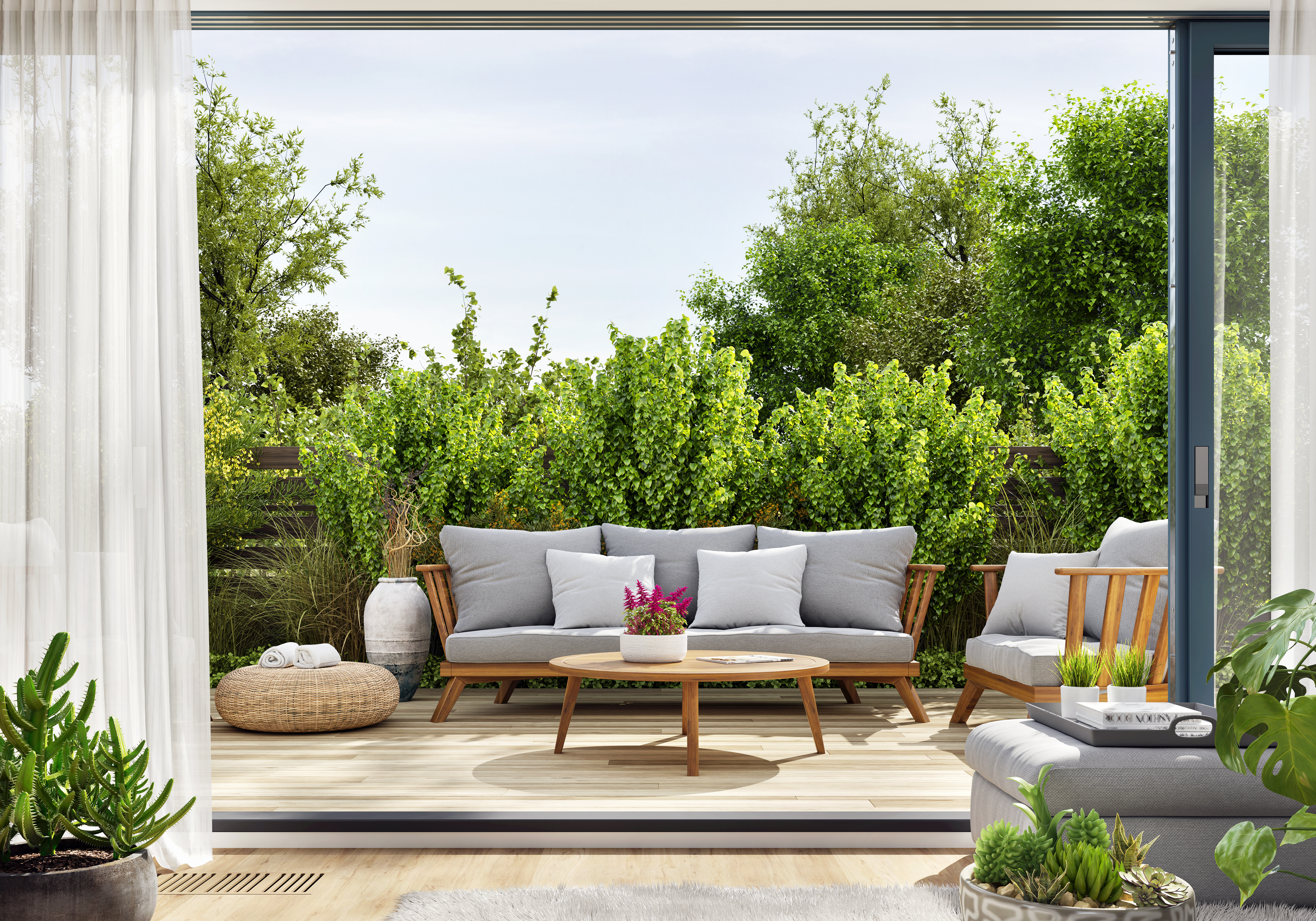 Seamless flow can be introduced with flush doors which glide, slide, fold or open to offer a stepless path between the inside and out. Flooring from the inside should be continued to the outside to continue an illusion of a larger space and carefully placed planting, furniture and accessories will merge the two areas together.