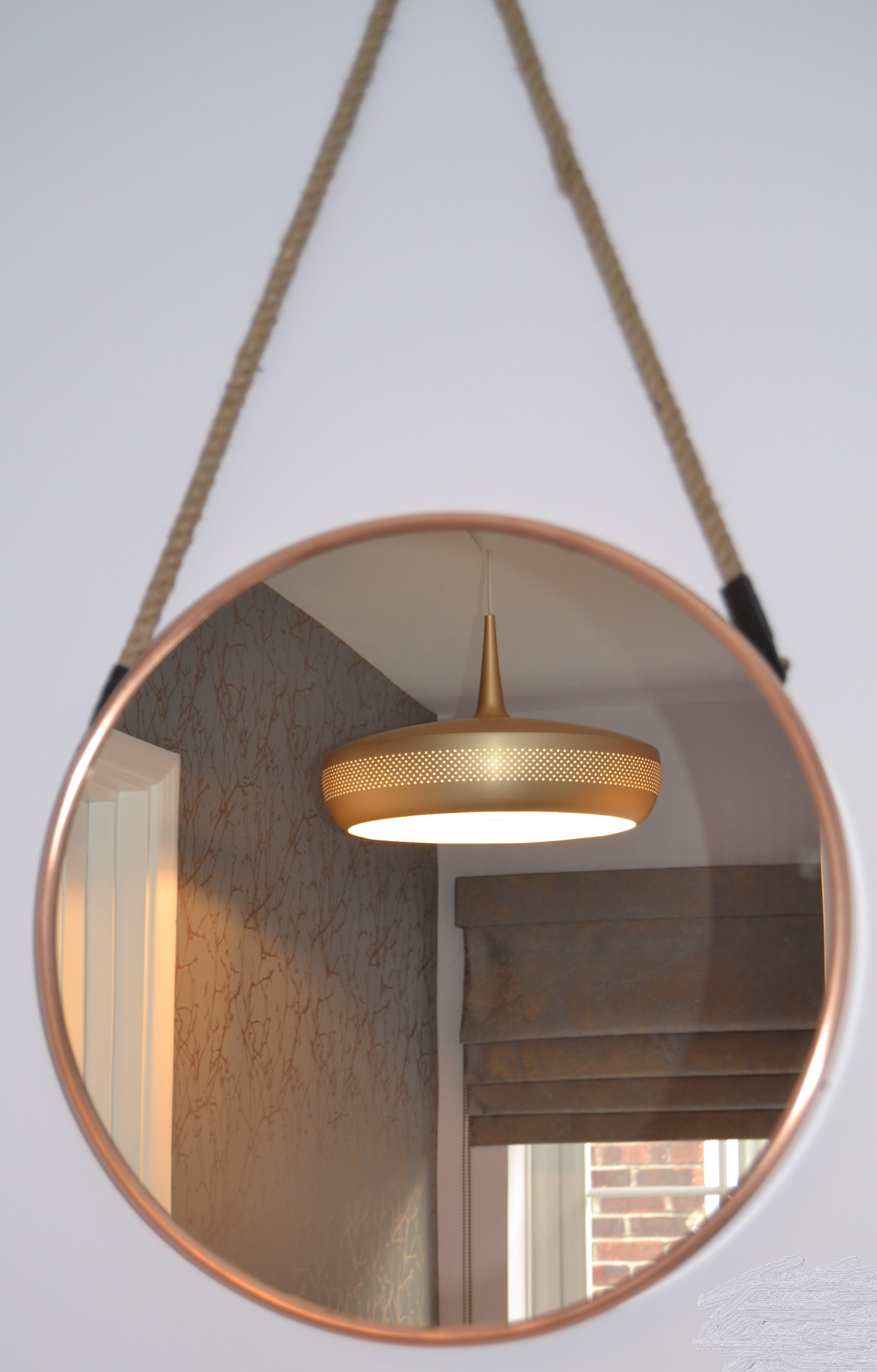 We love the current trend for round mirrors which work very well in a country or contemporary setting. For our client we chose this copper framed mirror hung on chunky rope which complemented not only the softer shapes from the other mirrors but also metallic colour tone in the light fitting as well as the metallic in the wallpaper.