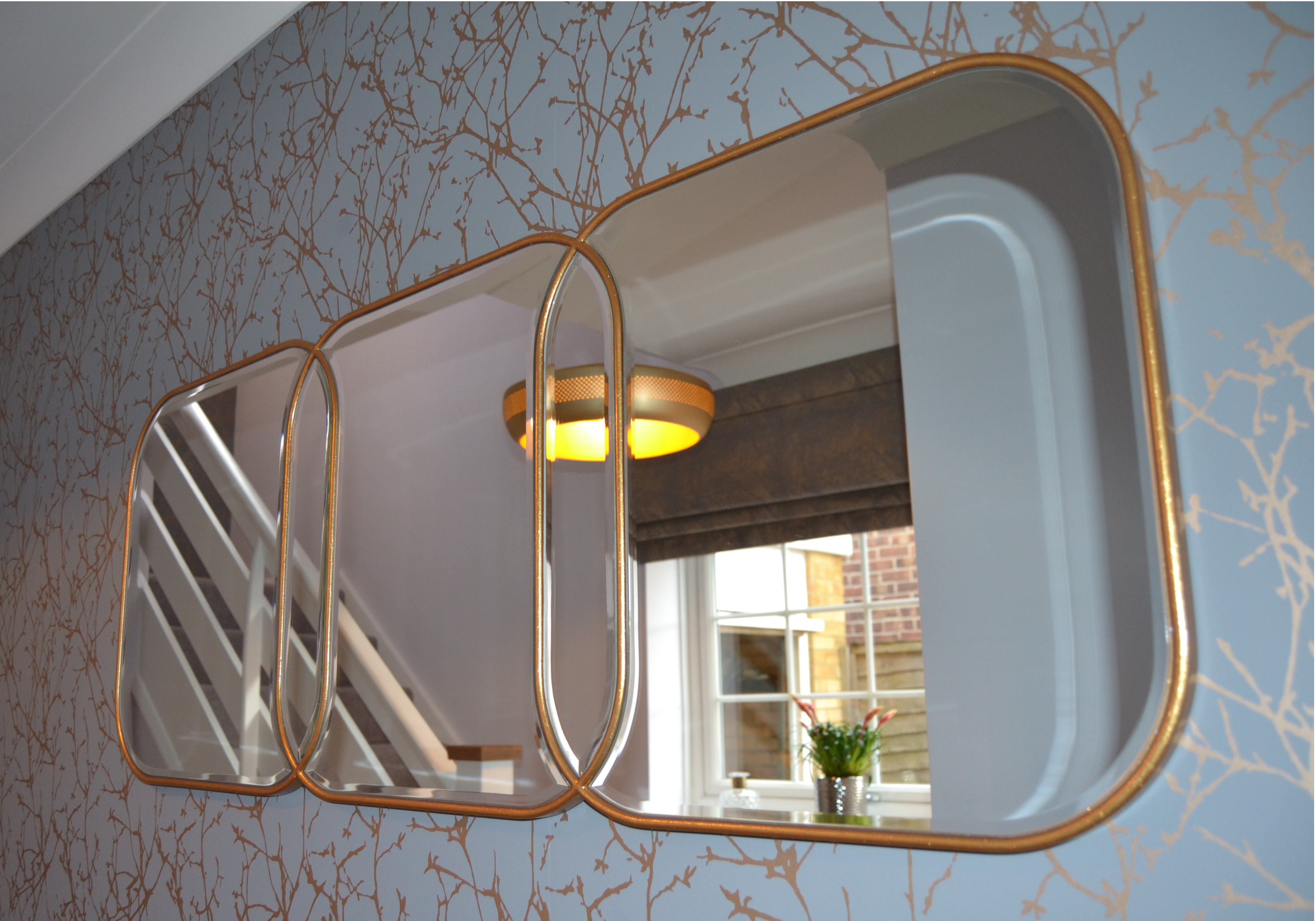 In a recent hallway that we designed the hall, stairs and landing had very limited natural light, but with the use of mirrors and a hint of metallic we maximised the light from the windows and bounced it off the mirrors to make the space feel lighter, larger and have more character.