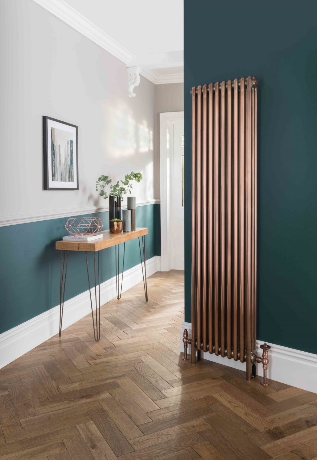The use of the dado rail, wooden flooring and vertical radiator in this hallway works perfectly!