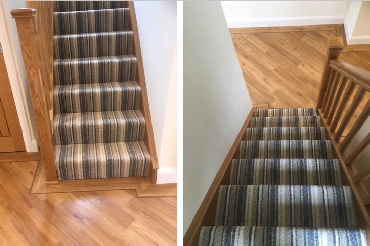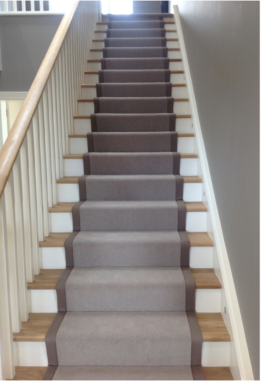 As you can see from this stair runner created by one of our trusted suppliers Hook Carpets the oak of the hall floor is carried up on the treads but the carpet, which is beautifully edged with a cotton binding creates the softness underfoot, which not only looks and feels great but also absorbs the sound when you are running up and down the stairs.