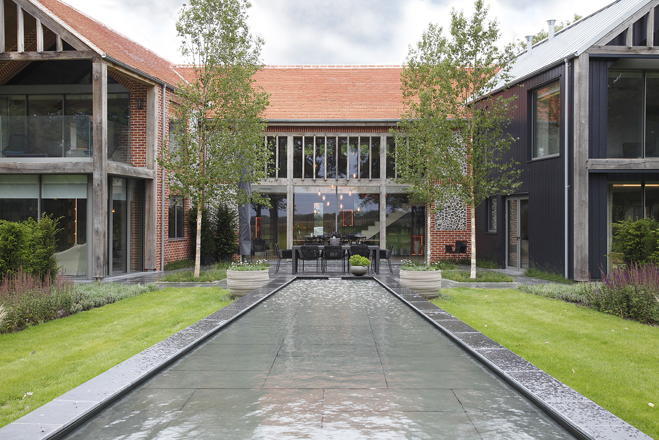 See how this fabulous garden created by Outside, a Hampshire based garden design company, connects the house to the garden. The elongated rill leads from the house into the garden like a path and is connected to the dining area allowing guests to appreciate the sound of water falling from one level to another.